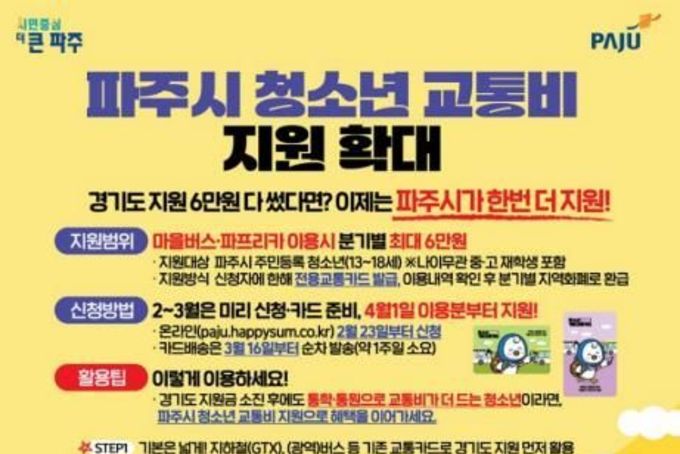 [아시아통신] 파주시는 청소년의 통학 교통비 부담을 실질적으로 줄이기 위해 기존 경기도 청소년 교통비 지원사업과 별개로, 파주시 여건에 맞춘 ‘파주시 청소년 기본교통비 지원사업(파프렌즈)’을 오는 4월부터 시행한다. '파프렌즈'는 경기도 지원금 한도를 모두 사용했거나, 마을버스·파프리카 이용 비중이 높은 청소년에게 분기당 최대 6만 원을 추가 지원하는 사업으로, 특히 통학 수요가 집중되는 마을버스와 파프리카(학생전용 통학순환버스) 이용 청소년을 중점 지원하는 데 목적이 있다. 지원 대상은 파주시에 주민등록이 있는 13~18세 청소년이며, 나이와 관계없이 파주시 거주 중고등학교 재학생도 포함된다. 소득기준 없이 대상 요건을 충족하는 청소년이라면 누구나 신청할 수 있다. 신청자는 파주시 전용 교통카드(파프렌즈)를 발급받아 실제 이용 내역이 확인될 경우, 분기별로 지역화폐를 통해 교통비를 환급받게 된다. 환급된 지역화폐는 파주시 관내 가맹점에서 사용할 수 있으며, 지역화폐 앱을 통해 전용 카드에 교통비로 재충전하는 것도 가능하다. 신청은 2월 23일부터 인터넷 주소에 접속해 회원가입을 하면 자동으로 완료