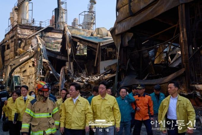 [아시아통신] 이재명 대통령은 21일 오후, 20일 대전 대덕구에서 발생한 안전공업 화재 현장을 찾아 피해 상황과 구조활동 전반을 점검하고, 유가족들의 목소리를 청취했다. 현장에 도착한 이 대통령은 소방차와 구급차 앞에 대기 중이던 소방대원들과 일일이 악수하며 구조활동에 최선을 다하고 있는 이들을 격려하고 남은 실종자 수습에도 만전을 기해줄 것을 당부했다. 이어 이 대통령은 소방청 중앙긴급구조통제 단장으로부터 사상자 현황 등 피해 상황과 구조자 의료 지원 현황, 실종자 수색 현황 등을 보고받았다. 보고를 받은 이 대통령은 발화 위치와 투입된 구조 인력의 규모, 실종자 수색의 진행 상황 등을 구체적으로 점검했다. 화재 현장을 둘러본 이 대통령은 화재가 빠르게 확산된 원인을 물으며 실종자 3명에 대한 수습과 함께 신속한 신원 확인을 지시했다. 또한 공장 건물의 붕괴 위험 등을 고려하여 2차 사고가 발생하지 않도록 안전에 각별히 유의할 것을 주문했다. 이어 이 대통령은 유가족 등 피해 가족을 만나 유가족들의 손을 꼭 잡고 위로의 뜻을 전했다. 이 대통령은 유가족들의