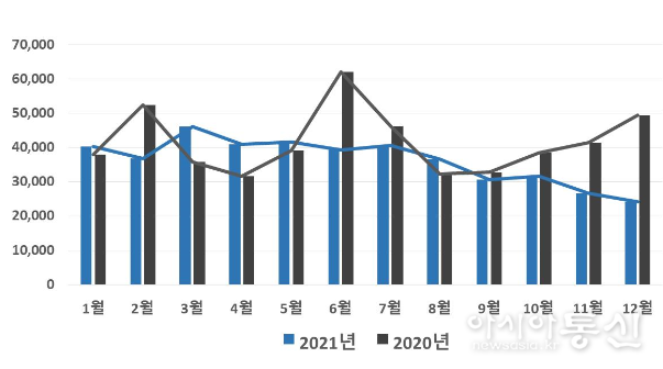 공개된 자료에 따르면 지난해 1월부터 12월까지 거래된 경기도 부동산의 총거래량은 43만5,426건으로 2020년 49만9,546건과 비교해 12.8% 감소했다.
