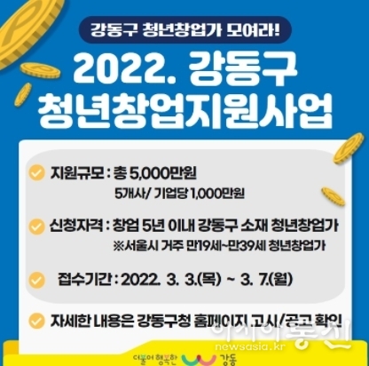 아시아통신 박해웅 기자 | 강동구가 3월 3일부터 3월 7일까지 ‘2022년 청년창업지원사업’에 참여할 기업을 모집한다.