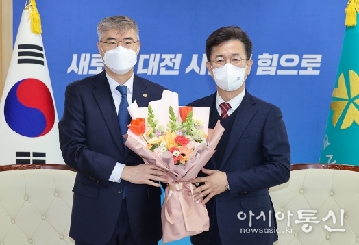 아시아통신 박해웅 기자 | 허태정 대전시장은 22일 대전 이전을 시작한 기상청 박광석 기상청장의 예방을 받고, 환영 꽃다발을 전달하며 새롭게 대전 시대를 열어가는 기상청을 환영하는 대전시민의 마음을 전했다.