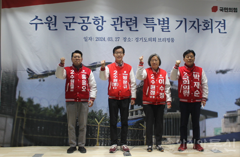 김현준 수원갑 후보, 홍윤오 수원을 후보, 방문규 수원병 후보, 이수정 수원정 후보, 박재순 수원무 후보는 27일 경기도의회에서 기자회견을 열고, "국민의힘은 말로만 하지 않겠다"며 "수원군공항 문제 반드시 해결하겠다"고 했다.