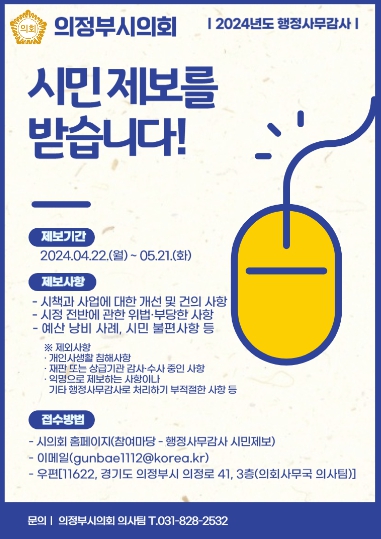[아시아통신] 의정부시의회는 2024년도 행정사무감사(6.11.~6.19.)를 앞두고 보다 내실있는 행정사무감사를 추진하기 위해 4월 22일부터 5월 21일까지 시민 제보 접수를 받는다고 22일 밝혔다.