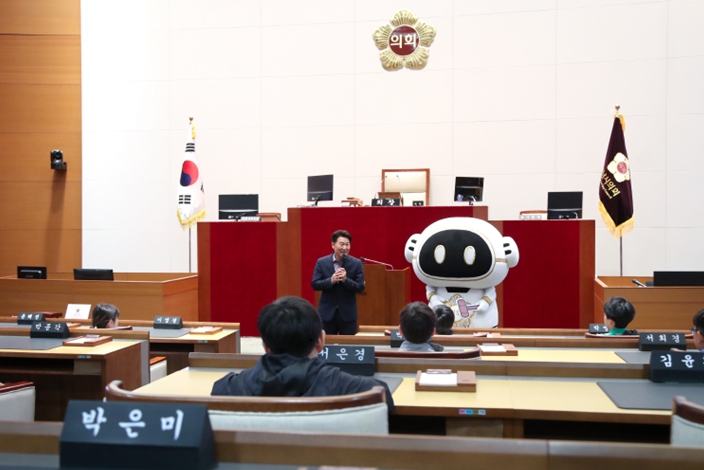 [아시아통신] 왕남초등학교 4학년 어린이들이 16일 오전 성남시의회 홍보관을 견학했다. 방문한 어린이들은 강상태 의원의 환영 인사를 받았다.