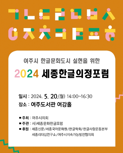 [아시아통신] 여주시의회는 다가오는 5월 20일, 여주도서관 여강홀에서 여주시 한글문화도시 실현을 위한 『2024 세종한글 의정포럼』을 개최한다고 밝혔다. 이번 '세종한글 의정포럼'은 정병관 여주시의회의장이 직접 주최 한것으로서, 여주시의 지역 정체성을 '한글과 세종'으로 형성하고, 여주시의 미래지향 발전적 변화와 개혁을 위한 한글문화 활성화를 논의하는 자리이다.