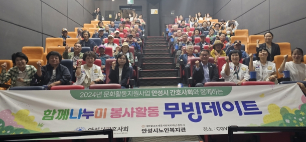 이날 진행한 영화관 나들이 활동은 경기도의회 황세주 의원과 안성시 간호사회 임원, 복지관 봉사자가 함께해 안성지역에 거주하시는 70세 이상의 소외된 어르신 40여 명을 모시고 영화 ‘스턴트맨’을 관람 후 지역사회에서 살아가는 이야기를 소탈하게 나누는 내용으로 구성됐다.