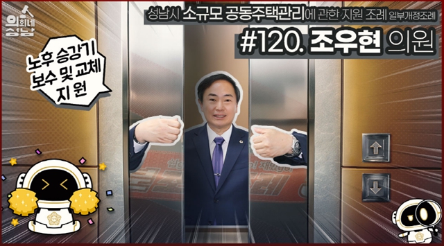 이번에 소개된 조례는 조우현 의원 등 14명이 발의한 ‘성남시 소규모 공동주택관리에 관한 지원 조례 일부개정조례’다. 이 조례는 소규모 공동주택의 관리업무에 필요한 비용의 일부를 지원하여 쾌적한 주거환경 조성과 삶의 질 향상에 이바지함을 목적으로 한다. 이번 조례로 소규모 공동주택 승강기도 지원 대상에 포함되어 어르신과 취약계층이 많이 거주하는 원도심의 노후 승강기 보수 및 교체를 지원함으로써 시민들이 보다 안전하고 쾌적한 환경에서 생활할 수 있기를 기대하고 있다. 이 조례는 2023년 12월 11일부터 시행 중이다.