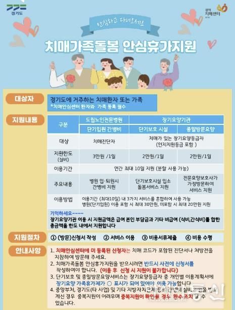 정부의 ‘장기요양가족휴가제’ 이용 시 발생하는 본인부담금을 경기도가 지원하는 방식으로 운영한다. 경기도민이면서 포천시 치매안심센터에 등록·관리 중인 치매환자 또는 가족이라면 사전 신청을 통해 혜택을 받을 수 있다.
