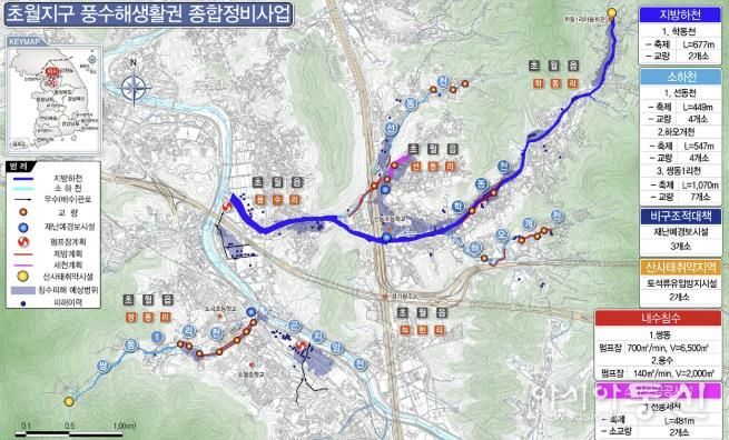 이에 시는 오는 2026년부터 설계에 착수해 2030년 준공을 목표로 5년간 총 433억 원을 투입한다. 주요 정비 내용은 ▲학동천 등 지방하천과 선동천·하오개천·쌍동1리천 등 소하천 종합 정비(축제 3.2㎞, 교량 재가설 17개소) ▲펌프장 2개소 설치 ▲산사태 취약지역 2개소 정비 ▲재난 예·경보시설 3개소 설치 등이다.
