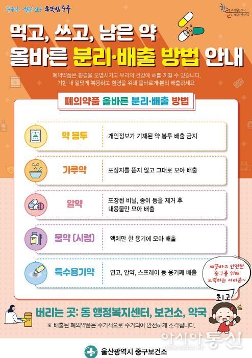 [아시아통신] 울산 중구보건소가 지역 내 약국, 보건소, 동(洞) 행정복지센터 등 96곳에 폐의약품 수거함을 설치해 운영한다.