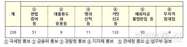 ① (해외자금 불법반입) 해외에서 1만 달러를 초과하는 현금을 휴대반입 후 신고하지 않거나, ‘환치기(외국환은행을 거치지 않고 자금을 불법반입)’를 통해 자금을 반입한 것으로 의심되는 경우 39건