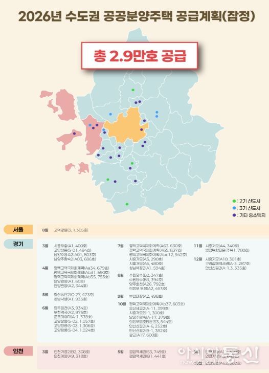 [아시아통신] 국토교통부와 4개 공공기관은 ’26년 수도권 공공택지에서 총 2.9만호 규모의 공공분양주택을 순차적으로 공급할 계획이라고 밝혔다.