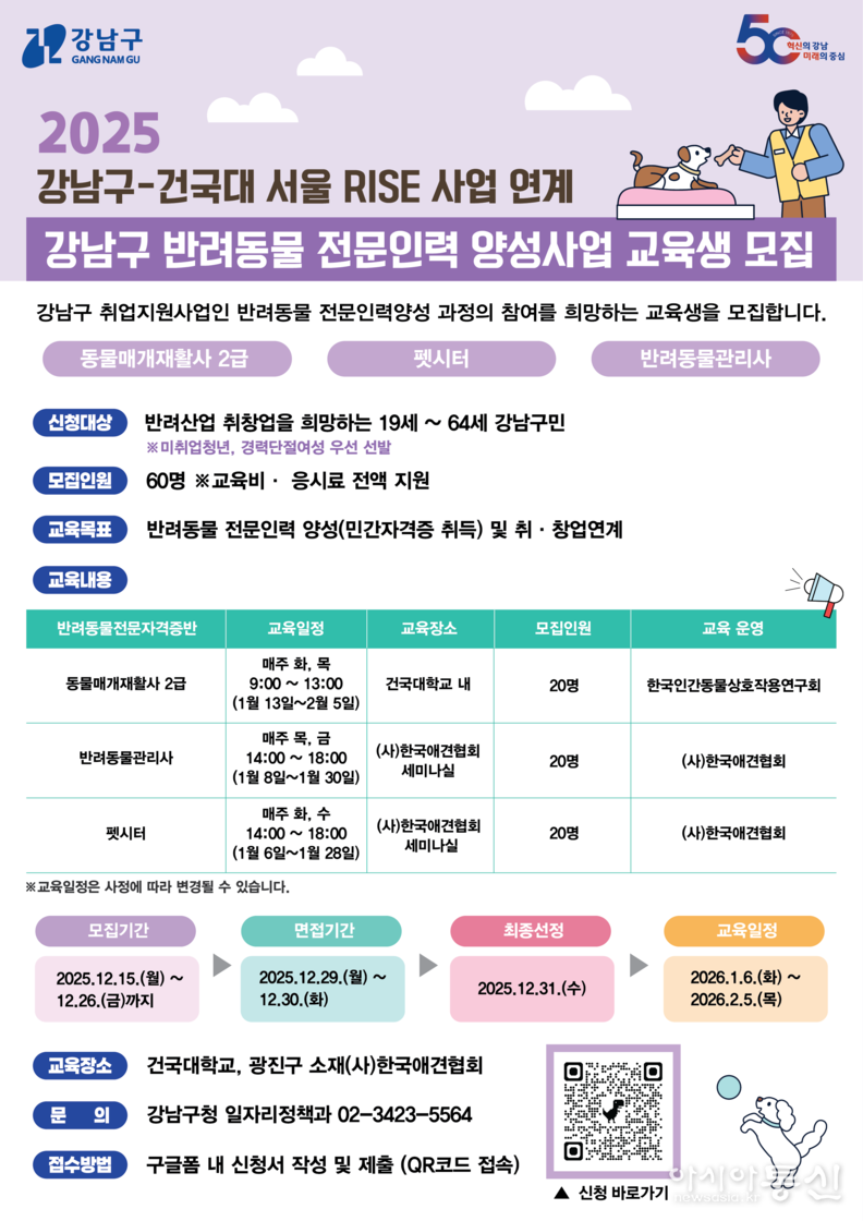 꿈이 모이는 도시, 미래를 그리는 강남구(구청장 조성명)가 급성장하는 반려동물 산업에 발맞춰 내년 1월부터 ‘반려동물 전문인력 양성 과정’을 운영한다. 오는 12월 26일까지 참가자를 모집하며, 전 과정과 자격시험을 전액 무료로 지원한다.