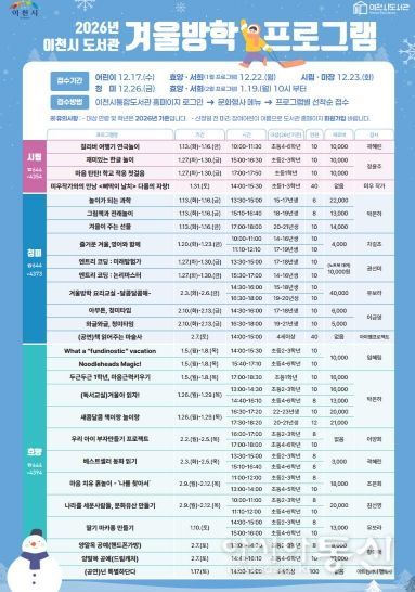 [아시아통신] 이천시는 2026년 1월부터 2월까지 겨울방학 기간에 어린이를 대상으로 한 다양한 독서문화 프로그램을 운영한다고 밝혔다.