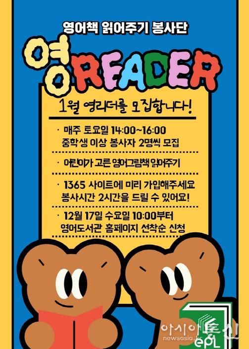 [아시아통신] 의정부영어도서관은 2026년 1월부터 영어책 읽어주기 봉사단 ‘영리더’가 참여하는 재능기부 프로그램 ‘Please Read a Book’을 운영한다.