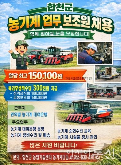 [아시아통신] 합천군은 농기계대여은행 운영체계를 강화하고 농업인 영농 편의를 높이기 위해 2026년 농기계 업무보조원 기간제근로자 9명을 채용한다고 14일 밝혔다.