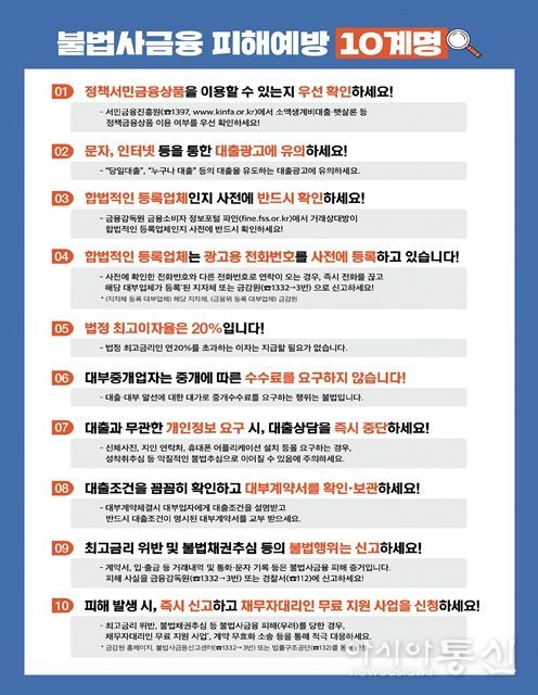 민사국은 불법사금융 피해를 사전에 차단하고 신속한 단속·수사를 위해 자치구 및 전통시장 상인회 등과 협조체계를 강화하고, 피해 신고 안내문을 배부하는 등 예방활동도 병행한다.