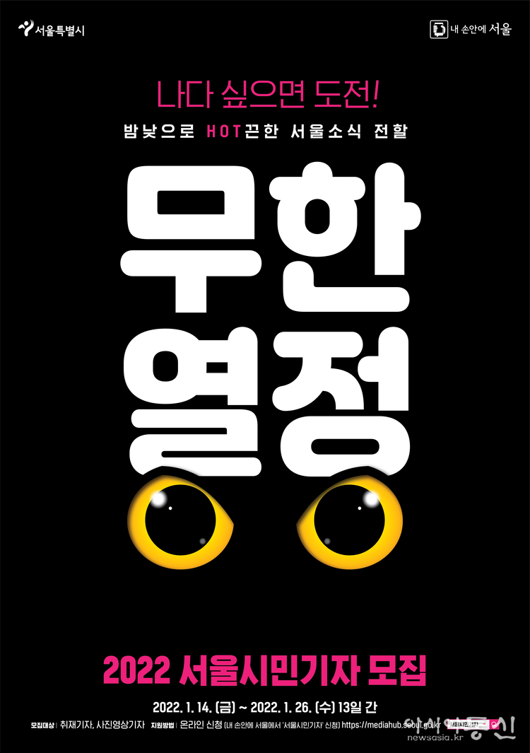 - 서울시 주요 정책, 행사, 시설, 생활정보 등을 취재할 서울시민기자 정기 모집 - 1.14.(금)~1.26.(수) 13일간, 서울시민 또는 서울생활권자 누구나 온라인으로 신청 - 시민이 직접 취재하고 경험한 ‘시민체험형’ 뉴스를 시 온라인 뉴스룸 <내 손안에 서울>에 발행 아시아통신 김광부 기자 |서울시는 2022년 2월부터 2023년 1월까지 1년간 활동할 ‘서울시민기자’ 정기모집을 시작한다. 모집기간은 1월 14일(금)부터 1월 26일(수)까지로, 서울시민 또는 서울생활권자(서울 소재 직장·학교를 다니는 시민)라면 누구나 신청, 가입할 수 있다. ‘서울시민기자’는 서울시를 대표하는 가장 규모가 큰 개방형 시민기자단으로, 서울시의 주요 정책·시설·행사·생활정보 등을 주제로 ‘시민이 직접 취재한 시민체험형 서울 뉴스’를 전하고 있다. 서울시민기자는 2003년 선발·위촉제로 시작하여, 2013년부터 시민 누구나 가입할 수 있는 개방제로 운영하며, 18년 동안 서울시민의 목소리를 대표해 오고 있다. 지난해에는 1,406명의 서울시민기자가 가입해, 청년 1인가구로서 경험한 ‘1인가구 지원사업’, 사회초년생으로서 취재한 ‘서울 영테크’, 학부모로서 바라본 ‘서울런’ 등 서울시 주요 정책에 관심을 갖고 시민의 눈높이에서 현장감 있게 기사로 전했다. 특히 1인 가구 밀집 지역을 순찰하는 안심마을보안관 야간 동행 취재 등에 적극 참여하며, 주·야간을 가리지 않는 ‘무한 열정’으로 활동에 임했으며, 백신 접종 후기 등을 영상으로 알차게 구성해 딱딱하고 지루하게 느껴질 수 있는 내용에 ‘꿀잼 본능’을 살려 흡입력과 재미를 담아 개인이 가진 뛰어난 역량을 기사에 녹여냈다. ‘2022 서울시민기자’는 ▲취재기자 ▲사진·영상기자 분야로 나눠서 모집하며, <내 손안에 서울> 및 서울시 홈페이지를 통해 온라인 신청(14일 10시부터 https://mediahub.seoul.go.kr/citizen/info/citizenInfo.do 에서 접수)할 수 있다. 이번에 모집하는 2022년 서울시민기자는 2월부터 2023년 1월까지 1년간 활동할 예정이다. ‘취재기자’는 글과 사진 중심으로 구성한 기사를 작성하며, ‘사진영상기자’는 사진과 영상을 중심으로 구성한 기사를 작성해 활동하게 된다. 기존 활동했던 서울시민기자도 2022년 활동을 계속하길 원한다면 모집기간 내 다시 가입 신청을 해야 한다. 최종 가입된 서울시민기자에겐 개별 메일을 통해 자세한 활동방법 및 기사작성 방법에 대해 안내할 예정이다. ‘서울시민기자’로 활동하면 소정의 원고료 및 서울시 주요 행사 초청 및 시정 참여기회가 주어진다. 기사가 채택·발행된 시민기자에게는 기자증 및 활동인증서 발급이 가능하며, 우수 활동 시민기자에게는 서울시장 표창장 수여 등의 혜택이 주어진다. 글쓰기 및 사진촬영 등 시민기자 활동 관련 교육 프로그램에도 참여할 수 있다. 서울시민기자가 작성한 서울소식은 서울시 온라인 뉴스룸 <내 손안에 서울>(mediahub.seoul.go.kr)에 게재되며, 매일(월~금요일) 아침 발송하는 뉴스레터(현재 구독자 87만 명)로도 전달되고 있다. 최원석 시민소통기획관은 “20대 청년부터 80대 어르신까지 다양한 연령과 직업을 가진 서울시민기자는 명실상부한 서울시민의 대표 소통 파트너”라면서 “서울특별시가 ‘소통특별시’가 될 수 있도록 서울시정에 관심 있고, 글쓰기·사진영상 촬영에 재능이 있는 시민들의 많은 지원을 바란다”고 말했다.
