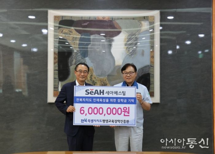 [아시아통신] 대한민국의 초일류 특수강 제조회사인 ㈜세아베스틸은 25일, 지역인재 양성을 위해 장학금 600만 원을 전북특별자치도평생교육장학진흥원에 2년 연속 후원했다. 이번 후원에는 서한석 대표를 비롯한 임원 10명이 참여해 뜻깊은 나눔의 의미를 더했다.
