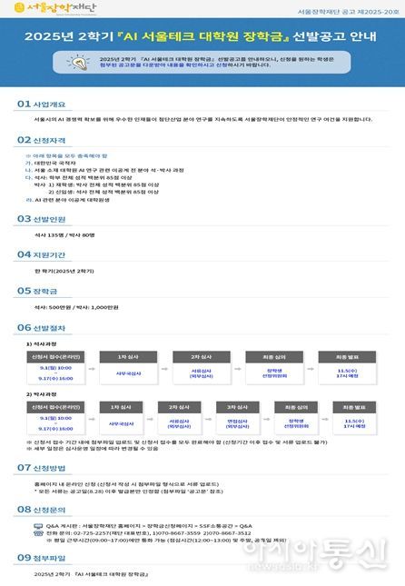 [아시아통신] 서울장학재단이 미래 AI 산업의 주역이 될 인재 육성을 위해 ‘AI 서울테크 대학원 장학금’ 지원 대상을 박사 과정까지로 확대하고, 오는 9월 1일부터 2학기 장학생을 모집한다.