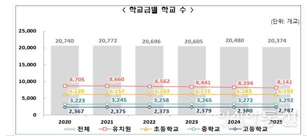유치원은 8,141개원으로 153개원 감소한 반면, 초등학교는 6,192개교로 9개교 증가, 중학교는 3,292개교로 20개교 증가, 고등학교는 2,387개교로 7개교 증가, 기타학교는 362개교로 11개교 증가했다.