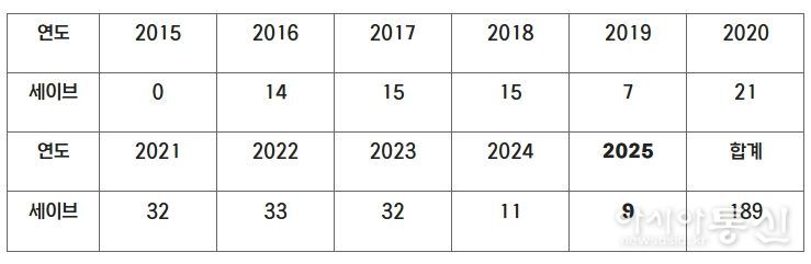 [아시아통신] 삼성 김재윤이 역대 6번째 6시즌 연속 10세이브와 역대 31번째 개인 통산 600경기 출장이라는 두 개의 대기록 달성을 눈앞에 두고 있다.