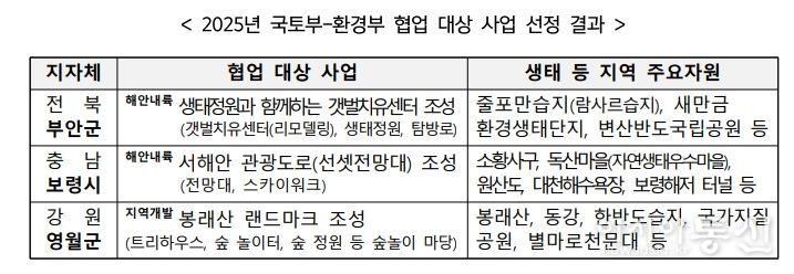 [아시아통신] 국토교통부와 환경부는 ‘지속가능한 지역균형개발 및 생태관광 활성화 연계’ 협업 사업 대상지로 전북 부안군(생태정원 및 갯벌 치유센터), 충남 보령시(선셋전망대), 강원 영월군(봉래산 랜드마크) 등 3곳을 9월 1일자로 최종 확정한다.