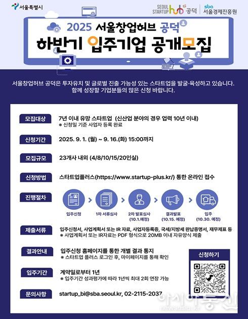 서울시가 운영하는 창업지원 종합거점인 ‘서울창업허브 공덕’에서는 9월 1일부터 9월 16일까지 16일간, 2025년 하반기 입주기업 23개사를 모집한다고 밝혔다.