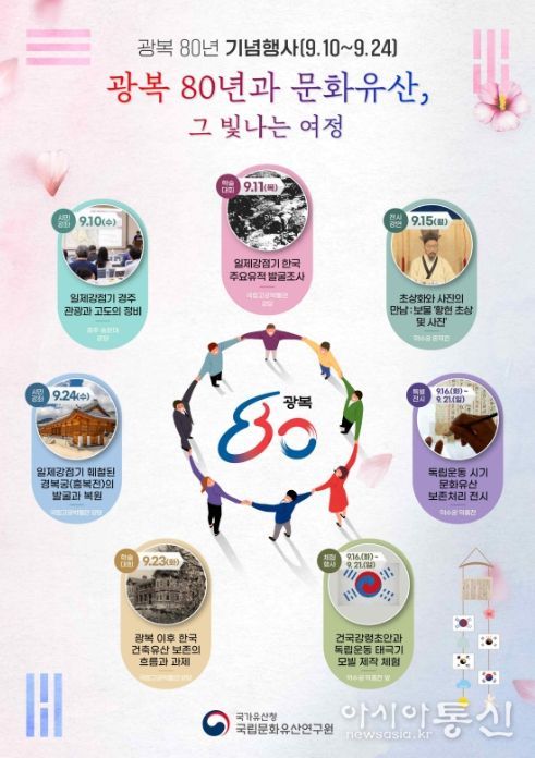 [아시아통신] 국가유산청 국립문화유산연구원은 국민과 함께 광복 80주년의 의미를 되새기기 위해 ‘광복 80년과 문화유산, 그 빛나는 여정’을 주제로, 9월 10일부터 2주간 고고·건축·미술·보존과학 분야에서 학술대회, 전시 및 체험, 시민강좌 등 다채로운 행사 7건을 개최한다.