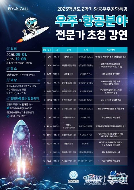 [아시아통신] 경상국립대학교 위성시스템핵심기술연구센터는 9월 1일부터 12월 8일까지 13차례에 걸쳐 우주‧항공 분야 전문가 초청강연을 진행한다.