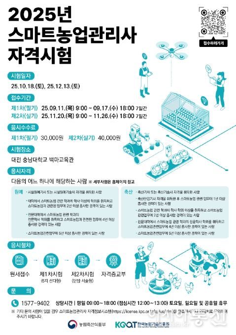 농식품부 김정욱 농식품혁신정책관은 “스마트농업관리사 자격제도는 농업혁신의 중심축으로 자리할 것”이라며, “ICT 기반 농업 생태계가 확대되는 지금, 자격시험을 통해 스마트농업의 확산과 고도화를 가속화하겠다”고 강조했다.