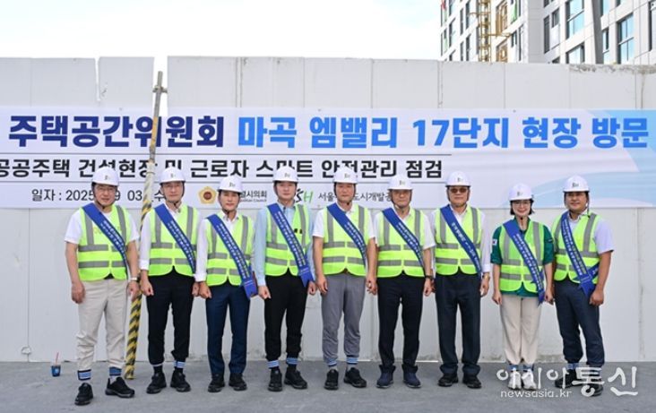 [아시아통신] 서울특별시의회 주택공간위원회(위원장 김태수, 국민의힘, 성북4)는 제332회 임시회 기간인 9월 3일, 서울주택도시개발공사로부터 주요 현안 관련 업무보고를 받은 뒤 강서구 마곡엠밸리 17단지 건설현장을 방문하여 온열질환 대응 모의훈련 및 스마트 안정장비 시연 등 안전기본수칙을 집중 점검했다.