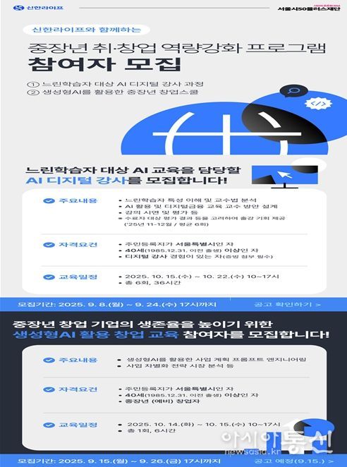 서울시50플러스재단은 신한라이프와 협력해 이번 사업을 공동 추진한다. 중장년이 디지털 전환 시대에 필요한 역량을 키우고, AI를 활용한 취·창업을 지원하는 이번 사업은 느린학습자 교육을 위한 ▲AI활용 디지털 강사 과정과 생성형AI를 활용한 ▲중장년 창업스쿨 등 두 가지 프로그램으로 구성됐다.