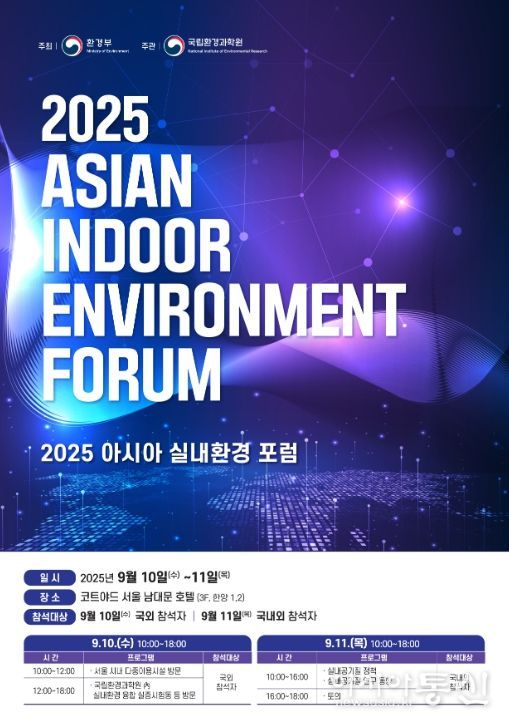 [아시아통신] 환경부 소속 국립환경과학원은 9월 10일부터 이틀간 코트야드 메리어트 서울 남대문 호텔(서울 중구 소재)에서 ‘2025 아시아 실내환경 국제 토론회(포럼)’를 개최한다고 밝혔다.
