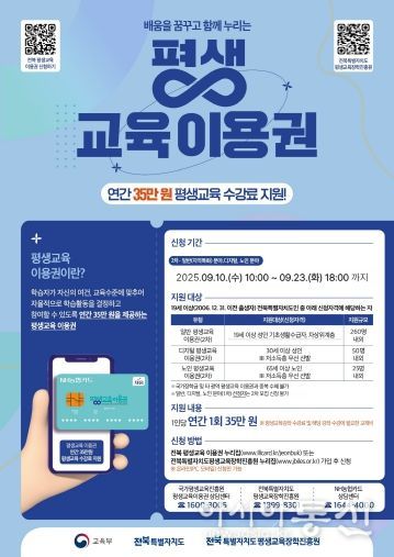 [아시아통신] 전북특별자치도와 전북특별자치도평생교육진흥원은 오는 10일부터 23일까지‘전북특별자치도 평생교육이용권(바우처)’2차 모집을 실시한다고 밝혔다. 이번 모집은 1차 모집에서 미선정된 도민에게도 평생교육 참여 기회를 보장하기 위해 마련됐다.