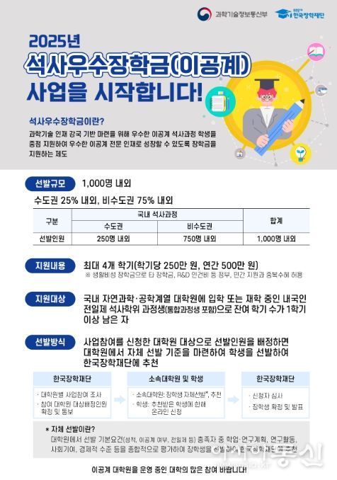 [아시아통신] 과학기술정보통신부와 한국장학재단은 2025년도 이공계 석사우수장학금 장학사업을 올해 처음으로 시행한다고 밝혔다. 이공계 석사우수장학금은 사업 참여 신청을 한 대학원의 소속 학생 중 장학생을 선발하며, 대학원 사업 참여 신청 기간은 9월 19일부터 10월 2일까지이다.