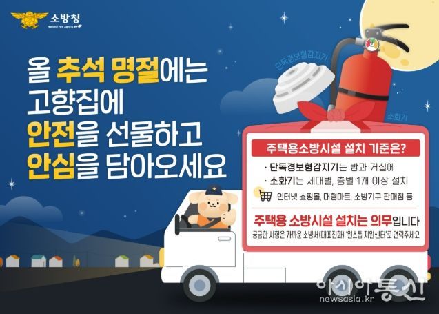 [아시아통신] 소방청은 추석 명절을 앞두고 오는 9월 26일부터 2주간 ‘고향집에 주택용 소방시설 설치하기’ 캠페인을 전국적으로 추진한다고 밝혔다. 이번 캠페인은 주택용 소방시설 자율설치 문화를 확산시키고, 국민이 직접 안전한 고향집을 만드는 데 동참할 수 있도록 하기 위한 취지다.