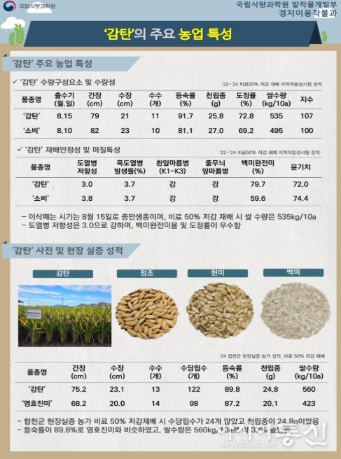 ‘감탄’은 비료 사용량을 절감하고 메탄 발생을 줄이는 그린라이스 품종으로, 비료를 50% 줄여도 수확량 감소가 약 7%에 불과하다. 밥맛이 우수하고 병해에도 강해 친환경 농업에 적합하다는 평가를 받고 있다.