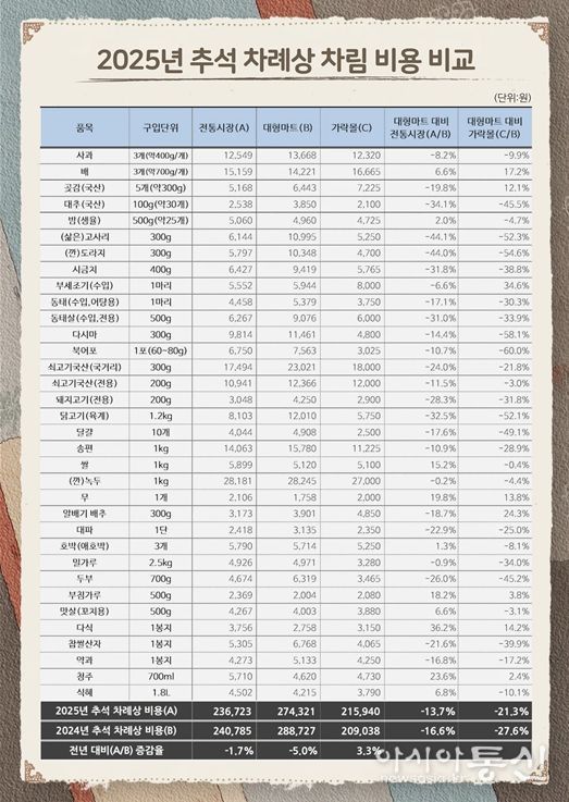 [아시아통신] 서울시농수산식품공사는 추석 명절 장보기에 도움이 되는 정보를 시민에게 제공하고자 서울시 내 대형마트, 전통시장, 가락시장(가락몰) 총 25곳을 대상으로 진행한 ‘추석 차례상 차림 비용’ 조사 결과를 발표했다.
