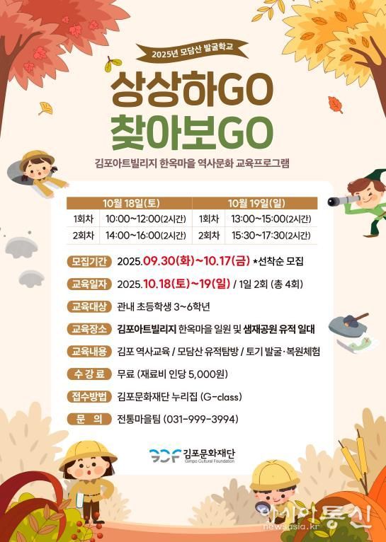 [아시아통신] (재)김포문화재단은 10월 18일과 19일 양일간 김포아트빌리지 한옥마을에서 초등학생을 대상으로 하는 역사문화 교육프로그램 ‘모담산 발굴학교’를 운영한다고 밝혔다.
