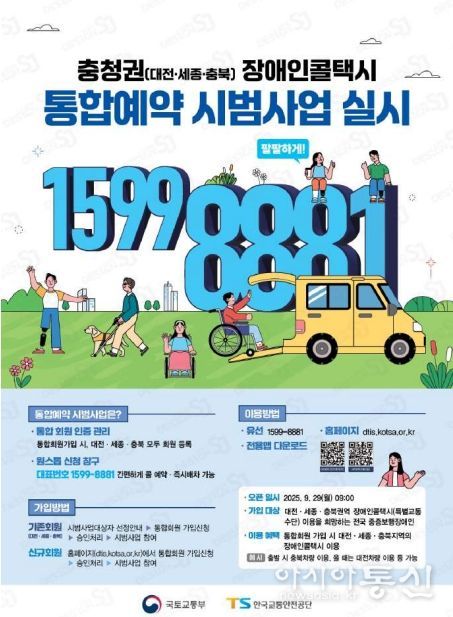 [아시아통신] 국토교통부와 한국교통안전공단은 중증 보행 장애인이 특별교통수단(장애인콜택시) 을 더욱 편리하게 이용할 수있도록 특별교통수단 통합예약시스템을 개발하여 9월 29일부터 대전 ‧세종 충북에서 시범운영에 들어간다.