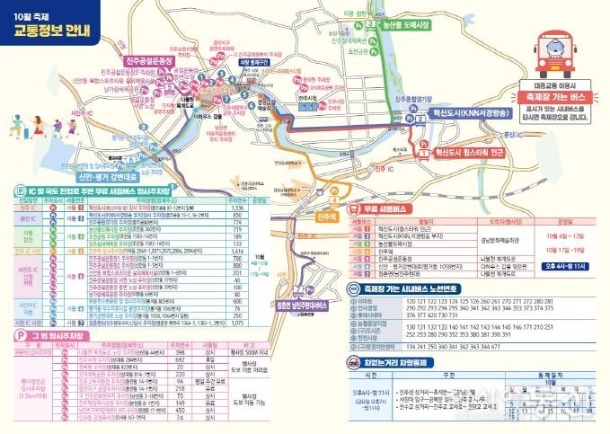 진주시 관계자는“관외 관람객은 고속도로나 국도 진입로 근처 임시주차장에 주차 후, 무료 셔틀버스를 이용하고, 진주시민은 올해 새롭게 시행된 청소년 100원 요금제 및 경남패스 등으로 혜택이 확대된 시내버스를 이용함으로써, 다함께 편안하고 안전한 축제를 즐길 수 있도록 관람객들께서 적극 협조해 주실 것”을 당부하며“축제장 주변 교통환경을 안전하고 쾌적하게 조성하여 관람객 이동에 불편함이 없도록 최선을 다하겠다”고 밝혔다.