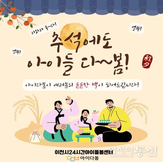 [아시아통신] 이천시는 추석 연휴 기간에도 이천시 24시간 아이돌봄센터인 ‘아이다봄’을 365일 24시간 정상 운영해 연휴 중 발생할 수 있는 돌봄 공백을 최소화한다고 밝혔다.