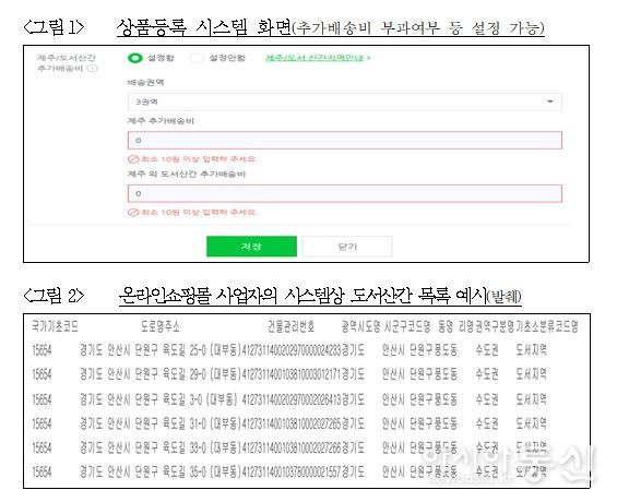이에 따라, 공정위는 주요 6개 택배사 및 18개 온라인쇼핑몰에 대한 추가배송비 부과 실태 점검을 실시했으며, 그 결과 13개 온라인쇼핑몰 사업자가 ‘도서’와 우편번호가 동일한 일부 ‘연륙도서’로 상품을 주문하는 소비자에게 추가배송비가 자동 부과되도록 시스템을 운영하여, 해당 시스템을 이용하는 온라인쇼핑몰 사업자 자신(직접 통신판매업 운영) 또는 입점업체(이하 ‘입점업체 등’)가 택배사로부터 추가배송비를 부과 받지 않았음에도 일부 연륙도서 소비자에게 추가배송비가 부과되고 있었음이 확인됐다.