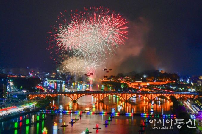 [아시아통신] 진주시는 4일 저녁 진주성 및 남강 일원에서 대한민국 명예 문화관광축제인 ‘2025 진주남강유등축제’의 화려한 막을 올리고, 오는 19일까지 남강의 가을 밤하늘을 수놓는다.