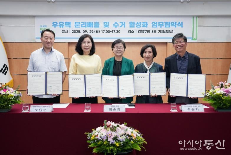 [아시아통신] 서울 강북구는 9월 29일(월) 구청 기획상황실에서 강북구어린이집연합회와 어진이마을관리 사회적협동조합과 함께 우유팩 분리배출 및 수거 활성화 기반 구축을 위한 업무협약을 체결했다고 밝혔다.