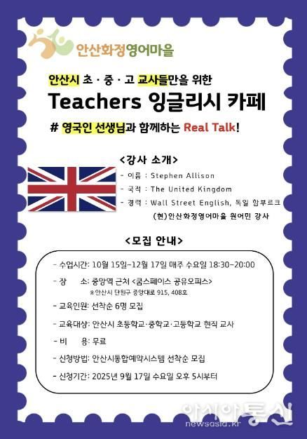 [아시아통신] 안산시 안산화정영어마을은 오는 15일부터 12월 17일까지 관내 소속 교사를 대상으로 ‘티처스(Teachers) 잉글리시 카페’를 운영한다고 10일 밝혔다.