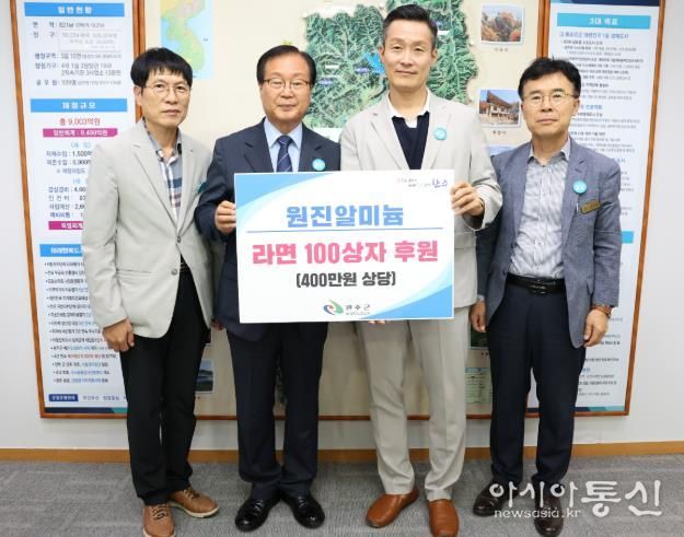 [아시아통신] ㈜원진알미늄이 완주군에 라면 100상자(환가액 400만 원 상당)를 전달했다.