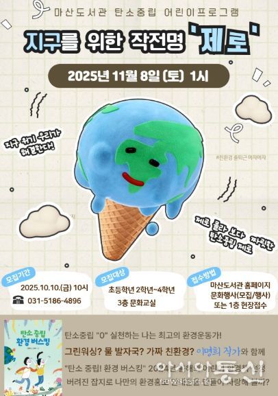 [아시아통신] 김포시 마산도서관에서 오는 11월 8일 오후 1시부터 3시까지, 초등학교 2학년~4학년 어린이를 대상으로 탄소중립 어린이 프로그램 책풍당당 '지구를 위한 작전명 ‘제로’'를 운영한다.
