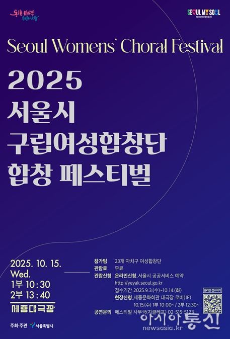 [아시아통신] 서울시는 깊어가는 가을을 맞아 오는 10월 15일 오전 10시 30분부터 세종문화회관 대극장에서 '2025 서울시 구립여성합창단 합창 페스티벌'을 개최한다. 이번 페스티벌에는 서울시 23개 자치구 여성합창단 700여 명이 무대에 올라, 아름다운 화음으로 시민들에게 잊지 못할 감동과 따뜻한 추억을 선사할 예정이다.